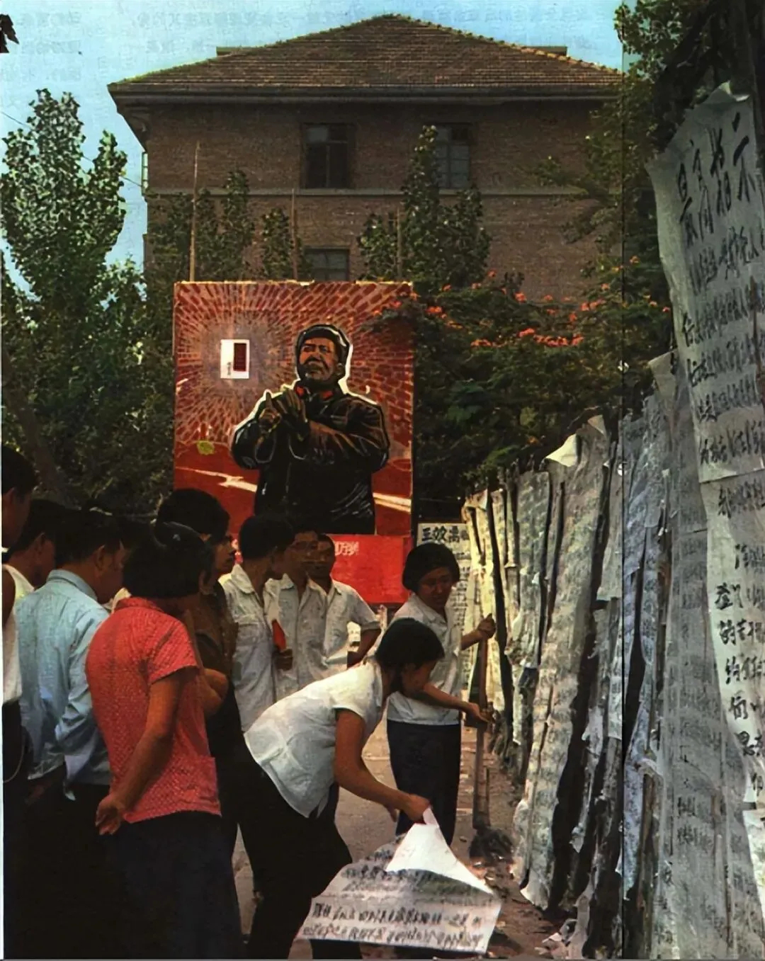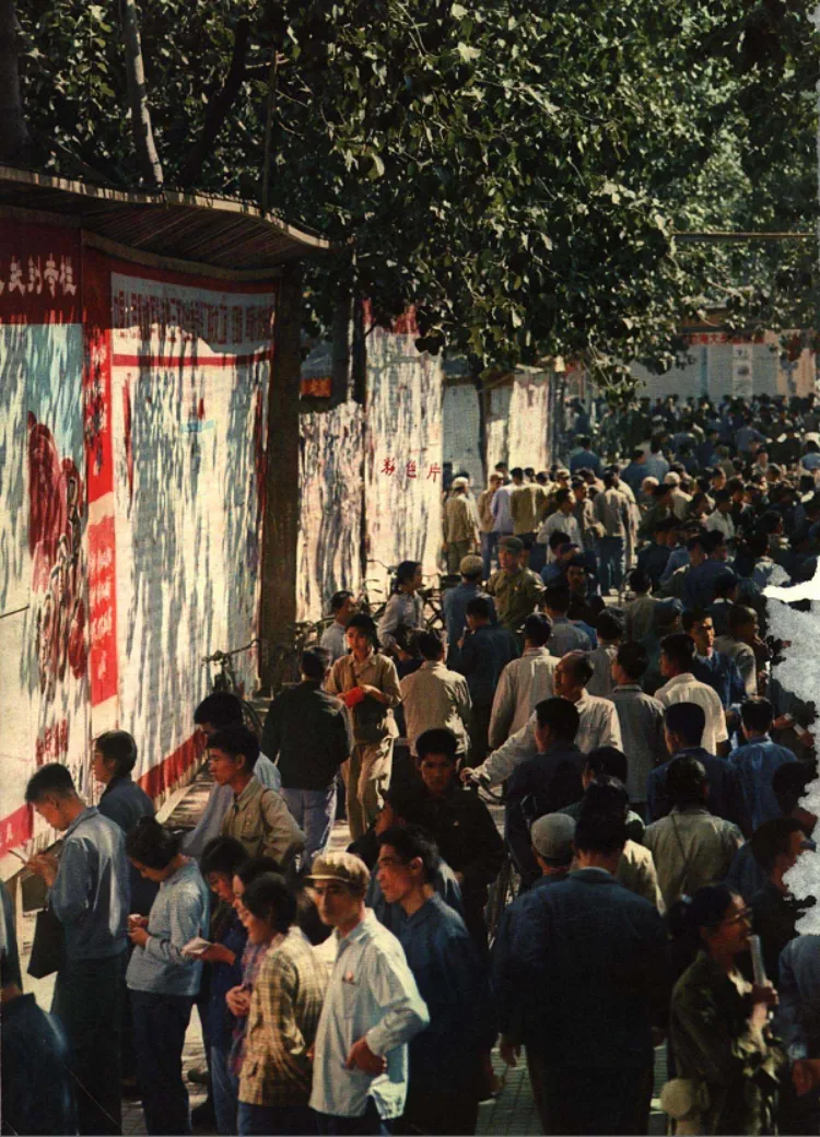1967年彩色老照片:在文革的号召下,年轻学子们纷纷走上街头,张贴大字报。
