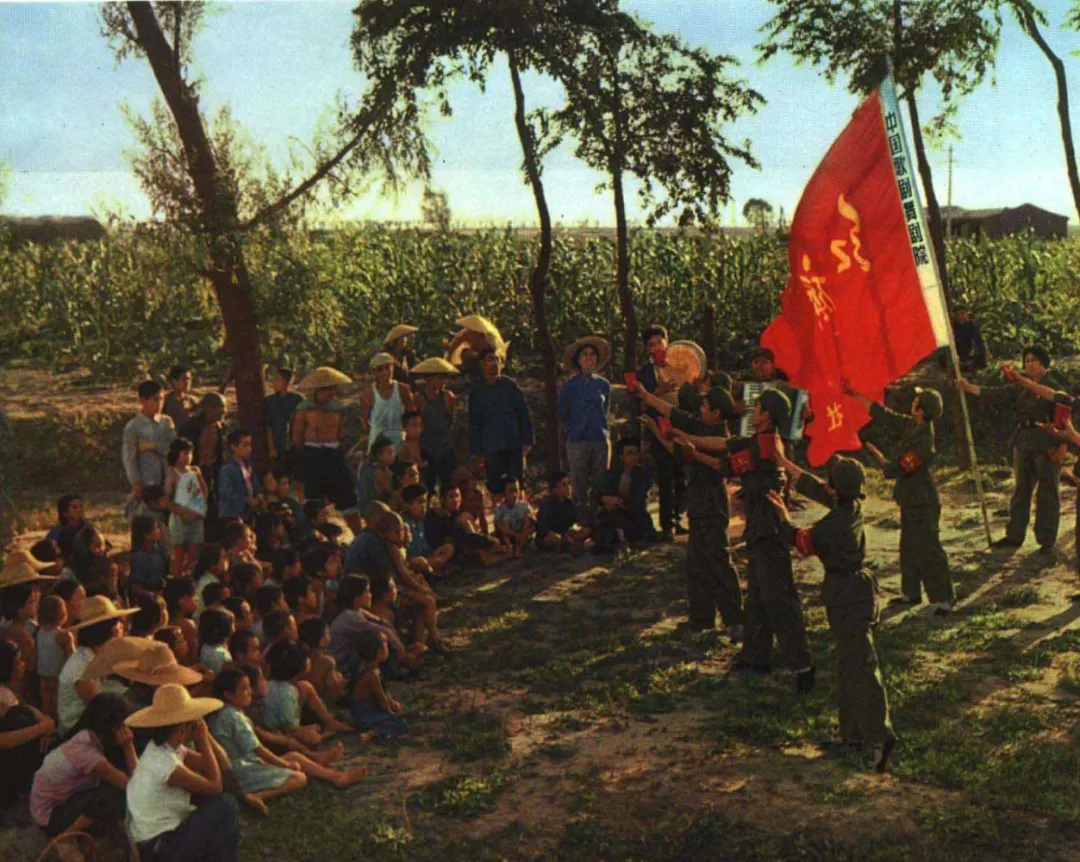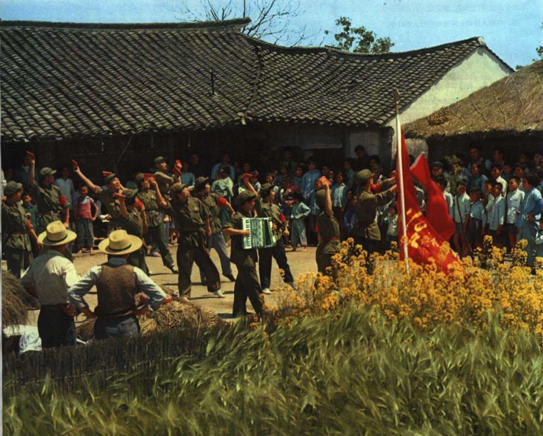 1976年彩色老照片:红卫兵到乡村为社员表演文艺节目。