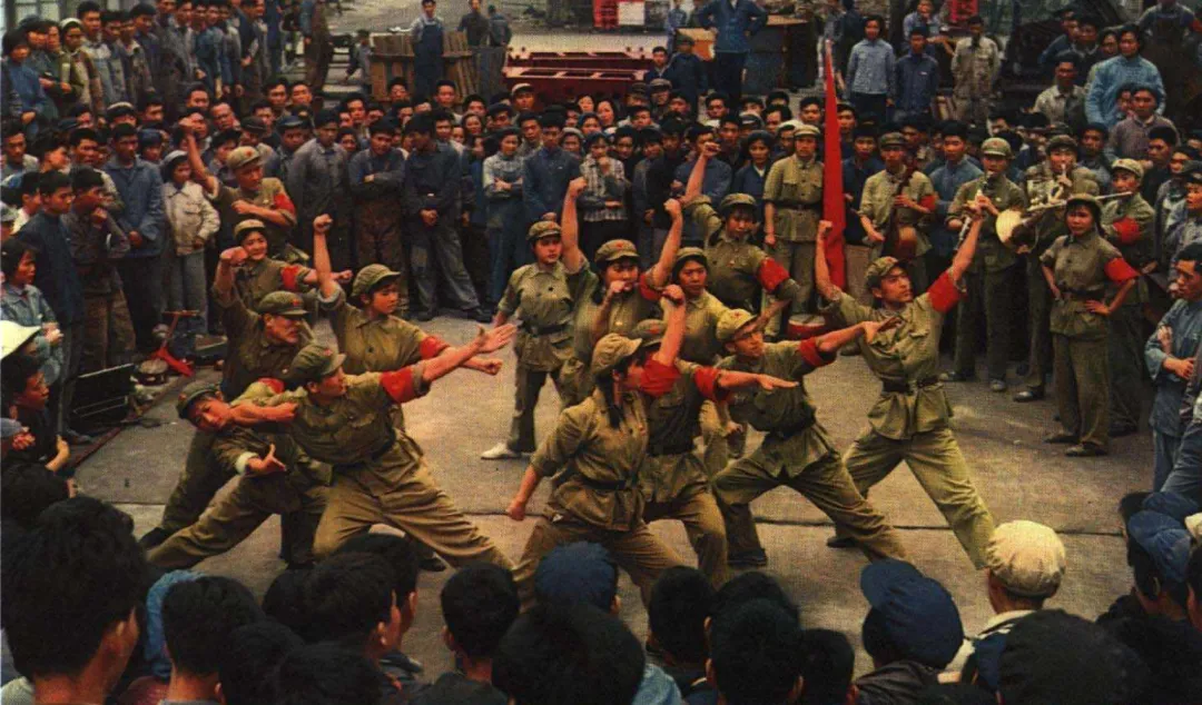 1976年彩色老照片:不忘阶级苦、牢记血泪仇。红卫兵小将们正在街头进行文艺表演。