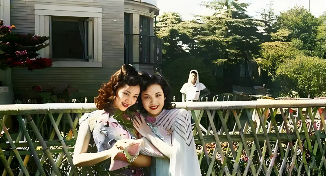 图中这段竹篱笆后靠着木结构的小洋房\u2009,\u2002两个姑娘相挨着笑成一朵花\u2009,\u2002这叫“庭院合影”\u2009,\u2002发卷是大波浪\u2009,\u2002腮边插小花\u2009,\u2002旗袍是印花的软缎\u2009,\u2002颜色淡却不虚\u2009,\u2002一看就知道是借着花园的光拍的\u2009,\u2002那会儿镜头不宽容\u2009,\u2002皮子粗一点都糊得慌\u2009,\u2002她们却稳稳当当顶住了\u2009,\u2002旁边站着个穿白衣的伙计\u2009,\u2002多半是场务或侍者\u2009,\u2002在一边护着秩序呢。