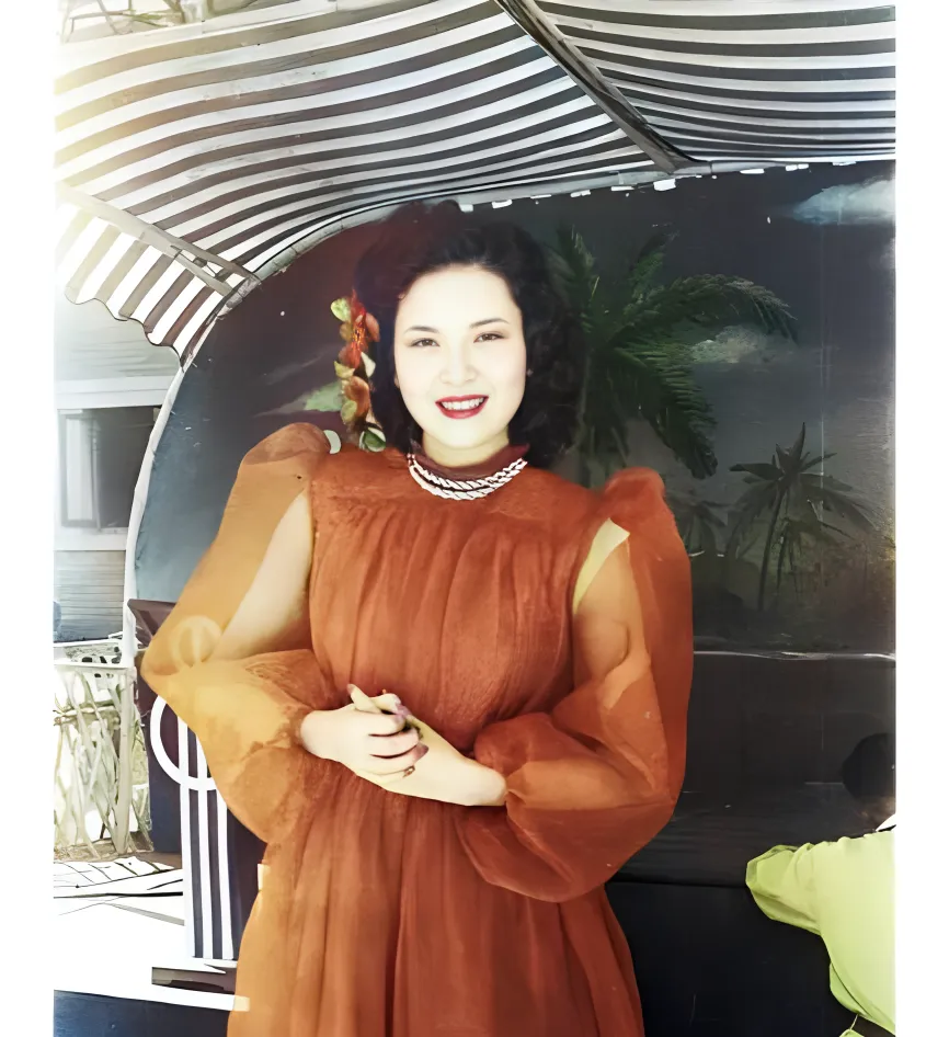 这个立在条纹遮阳棚下的姑娘\u2009,\u2002穿的是暖色纱袖礼裙\u2009,\u2002袖子鼓鼓的像两朵云\u2009,\u2002胸口一串珍珠项链压住了褶子\u2009,\u2002整个人亮晶晶的\u2009,\u2002这会儿她手里攥着张卡片\u2009,\u2002多半是号牌或者捐票\u2009,\u2002那年头舞台灯一打\u2009,\u2002布料发出细细的折光\u2009,\u2002人还没走上台\u2009,\u2002台下就“哗”地一阵响。