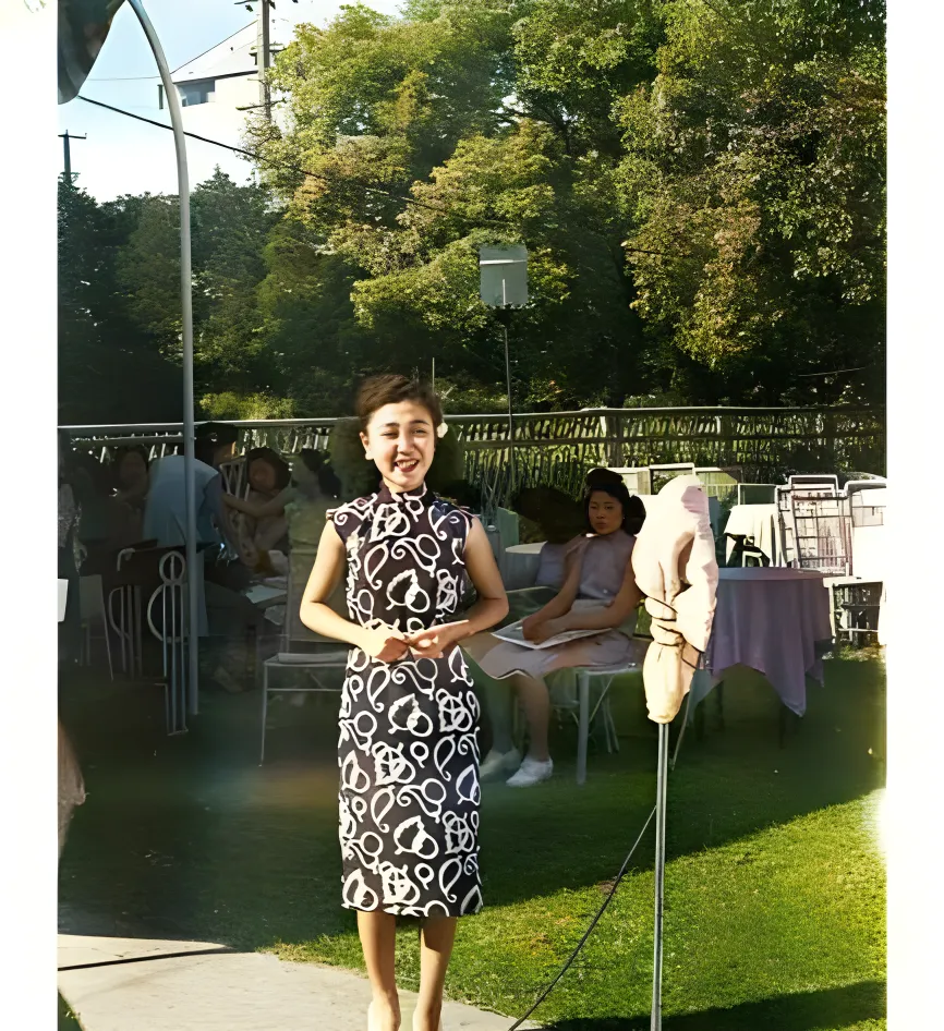 这个黑白花的旗袍姑娘前面竖着个小话筒\u2009,\u2002台下人坐在藤椅上歪着看\u2009,\u2002草地晒得发亮\u2009,\u2002这叫“草坪走台”\u2009,\u2002走到话筒前要做个自我介绍\u2009,\u2002声音不能抖\u2009,\u2002脚下步子还得稳\u2009,\u2002我小时候跟着奶奶看露天电影\u2009,\u2002场子一有风就把声音吹碎了\u2009,\u2002这张照片能看出风向顺着棚子走\u2009,\u2002难怪她笑得那么用力\u2009,\u2002怕风把字儿吹没了。