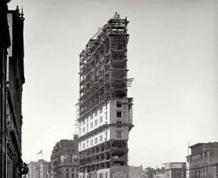 这半截竖在街口的架子是正在起楼的骨架,木梁钢桁一层层往上,底下人像豆子一样小,楼面只完到一半,风从空心肚子里穿过去,声音是呼的,那会儿的城,一边是起灰的工地,一边是还没拆的旧屋,现在楼一下子蹿到云里,脚下倒没了这种空当。