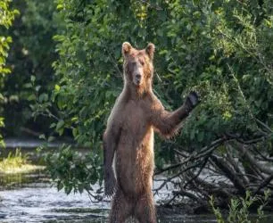 别看这只站水里的大个子,它是野外的棕熊,两爪一前一后撑着水面,身上毛被水贴得顺,半抬着头像跟你打招呼,河岸边树叶压下来,风里带着潮味,这张虽不在清末的院墙里,可放在一捆老照片里也不违和,自然这玩意儿古今都一个样,按它的路走,别打扰就是。
