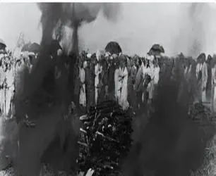 这堆黑烟卷起的场面是焚烧违禁之物,人群站得密,白衣灰衣混在一起,火苗被风一扯就斜过去,照片边角糊成一片,像热浪把镜头烫了一下,那时候的人挤在一处看热闹也看规矩,爷爷说别离火太近,火急眼不认人。