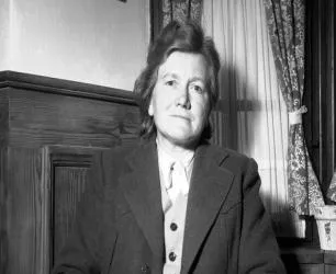 这位坐在木墙边的女人是一位命运多舛的姐姐,发梢往后拢,神情收着,不争不抢的样子,西装外套有点肥,房间里窗帘是小碎花,光从侧面打进来,她身上那种沉静的味道,像战后很多人共有的疲惫,现在照片一修就亮,那会儿的灰度却把人的起落都裹住了。