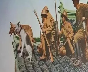 这张动作劲儿足,叫屋脊上搜查,瓦当一列列排着,几个人端着家伙,旁边一只狗探着身子往前嗅,鞋底踩在瓦上发出干脆的响,天空压得低,风把衣角鼓起来,这种画面看着怕,可也真,屋顶上走的人和狗都得胆子硬点。