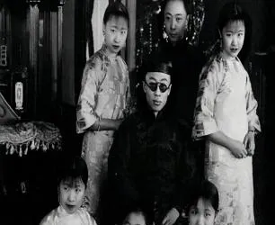 这张屋里头灯影重重的照片是宅门里的合影,中间的人戴着墨镜,黑袍到脚,旁边一圈年纪不一的女眷,领口窄,袖子短,背后木柜上摆满摆件,镜框里的人看你不看你都一样,规矩从衣角到坐姿全在那儿,像帖儿一样压着。