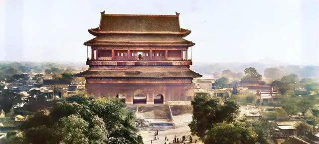 图里这座楼叫鼓楼,红墙灰瓦站在城脊上,檐角挑着金铃子,风一过叮的一声藏进树影里,城下人来人往肩挑手提,车辙压着青石路纹一路弯下去,爷爷说从这楼下穿过去心里就稳,知道家还在前面不远,现在高楼一堵再堵,抬头也少见这样舒坦的天与檐了。