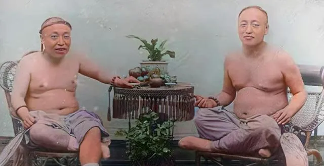 这张里的藤椅与小茶几可眼熟,两位爷们儿赤着膀子坐风口里纳凉,桌上搁着紫砂壶与铜烟斗,胸前的汗印子一圈一圈,茶托碰一下叮的一声,小勺沿壶口刮过,那会儿的夏天没有风扇,靠院里这点阴凉和一盏热茶顶着日头过。