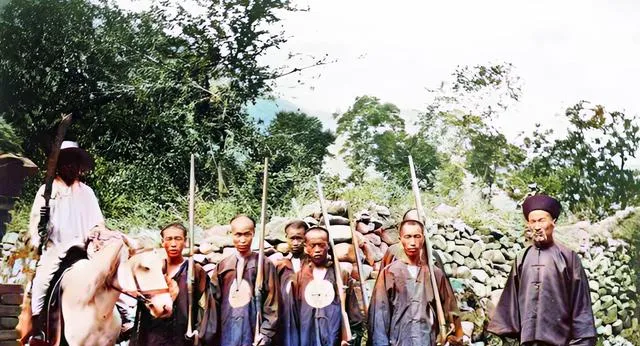 图中这一排小伙子叫团练,手里长枪冷不丁一杵地上,后头一匹小马抖着鬃毛,衣胸前的圆牌子一挂就知道哪一都哪一营,乡勇练阵脚的时候脚步要齐,教头一吼肩背就绷住,我爸说他小时候站墙根看过两回,知道这活不轻松。