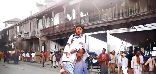 这担子上坐着的简易肩舆,那会儿人赶路没车,靠两条胳膊抬着走,前头汉子咬着牙往前杵,后头人跟着让开道,街边二层木廊挑出来,窗格子一排排,太阳一斜整条街都被烫得发白,现在打个车点一点就到门口,以前出趟门要先攒一身力气。