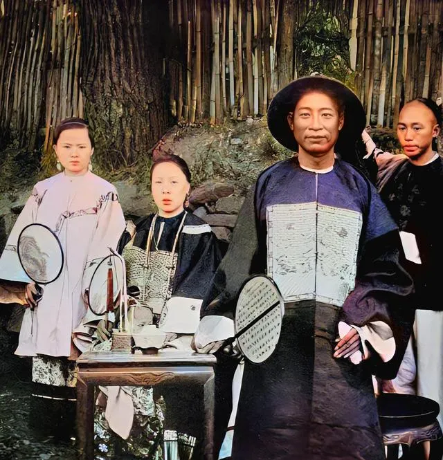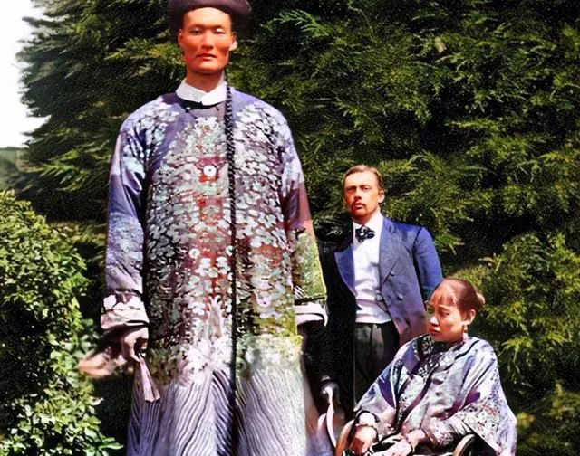 这个高个子站在前头叫九品官,也有人直接喊他大个子,袍子上绣着细碎团花,腰里别着玉坠,身后洋面孔手插兜站着,草地被压出一道浅印,镜头把彼此都框进来,东西相看半天也没谁躲谁,照片就这么把两边的日子撞在一块了。