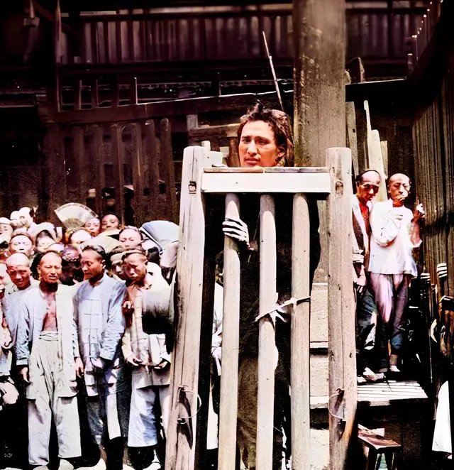 这个木栅子叫囚笼,四面竖条把人卡在当中,脚下的砖一块块往外抽,眼神从人堆里冒出来,旁边围一层又一层看客,扇子摇着却谁也不说话,历史书里三句话带过,图上这一刻却拖得很长,阴影在脊背上挪一步就更冷一分。