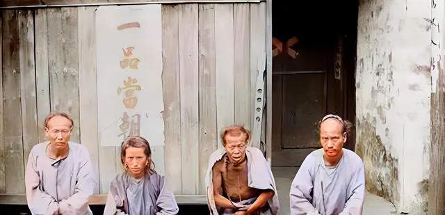 这四位坐门槛边打盹儿,背后木板墙上贴着匾,写着一品当朝几个大字,袖口磨起毛,裤脚拖了边,左边那位的发髻松到耳根,像是刚从铺子里出来歇口气,城里慢的时候就是这样,日头移半尺,他们也就挪半步。