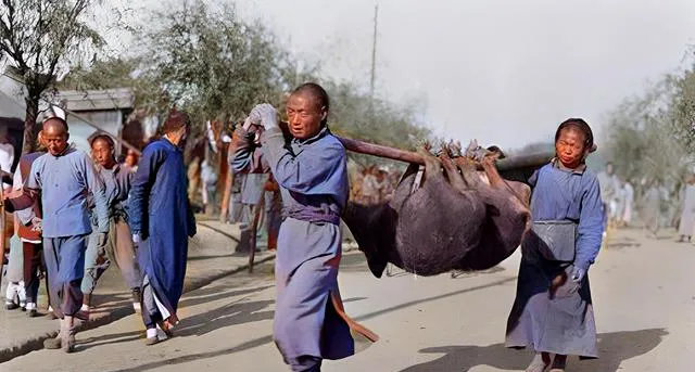 图中的两位用木杠抬着黑猪,猪脚被绳子一捆,肚皮朝天跟着抖,一路走一路有人让道,尘土被脚掌子拍起来,赶集的味道就这么冲上来,小时候跟在后头看热闹,娘嘱咐别靠太近,说这家伙拱一下能顶翻人。