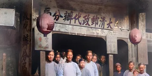 这块牌匾上写的是清邮政分局,门檐下挂着红灯笼,伙计们穿同样的灰蓝衣,胸口口袋鼓鼓,像是装着票据,队里谁要寄封信就跑来这儿,掌柜按秤一放,算盘拨两下,啪地盖个章,手背上的墨迹两天都洗不掉。