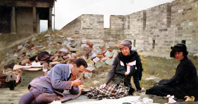 这几位在城墙根儿下铺了格子毯子,边上砖块堆得乱,壶里茶倒出来凉半截,手里拿着点心啃两口,风从墙缝里往外钻,帽檐压得低,表情松松的,偶有路过的脚步停一下,心里嘀咕这姿势真讲究,现在公园野餐也常见了,那时可算稀罕。