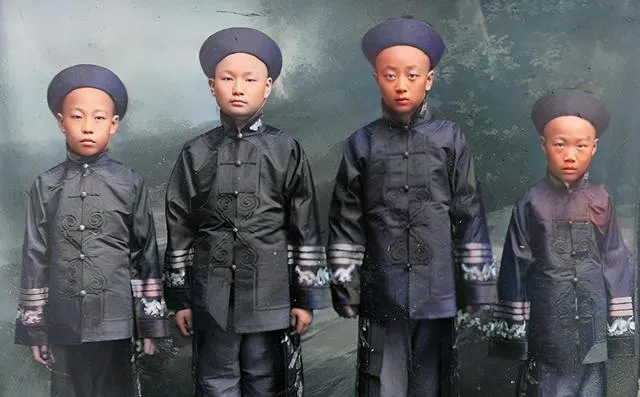 这四个小子穿着一色的绸衣马褂,黑得发亮,袖口与下摆缀着银线纹,帽子圆圆一顶,站得板直,耳后的小辫子贴着脖子,拍完照估摸着还要去学堂背书,先生一伸手把字帖往桌上一摊,竹板不动,心就不敢飞。