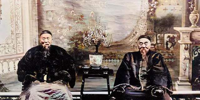 最后这张是两位老者的厅堂照,身后是画屏与瓷瓶,台面正中摆着一盆开得正好的花,皮袍一翻边就露里衬的绸光,胡子捻得服帖,笑意从眼角往外泛,屋里炭盆应是热的,镜头前的人不用摆姿,就把体面两字落得稳稳的。
