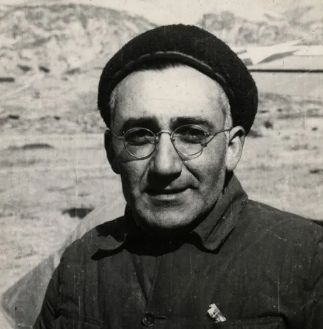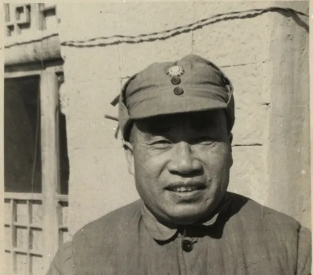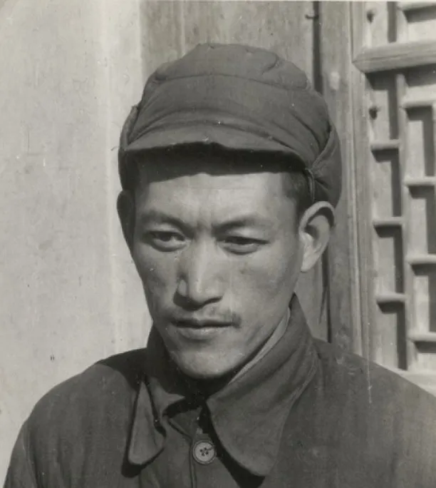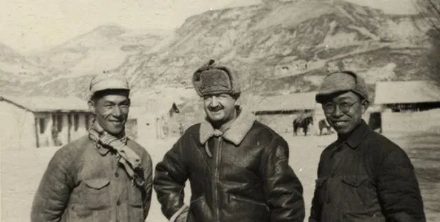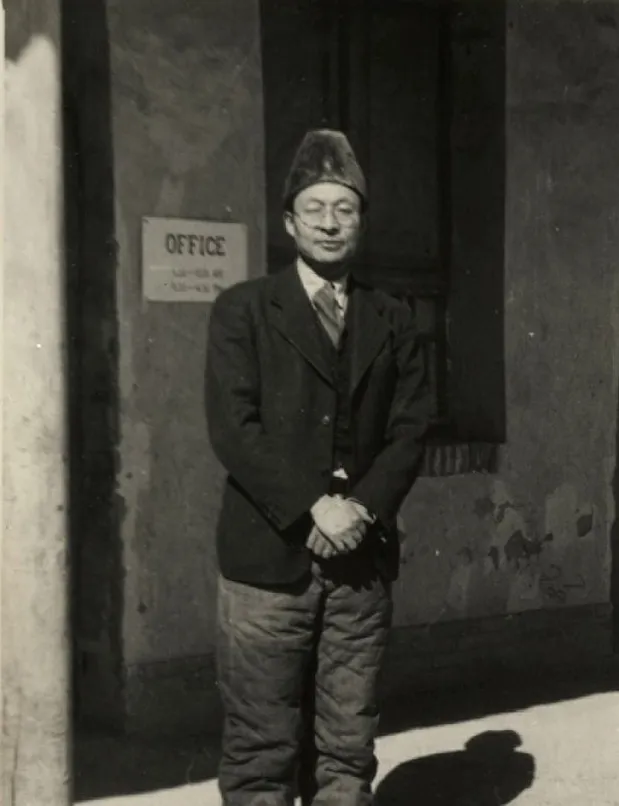 图里这位穿西装配棉裤,头上顶个毛皮高帽,门旁立着一块写着office的牌子,中西搅在一处,站姿倒很谦和,双手交叠,袖口露出一点衬衫,那时的延安,谁都在找法子御寒,里头棉厚,外头体面,两边都顾着。