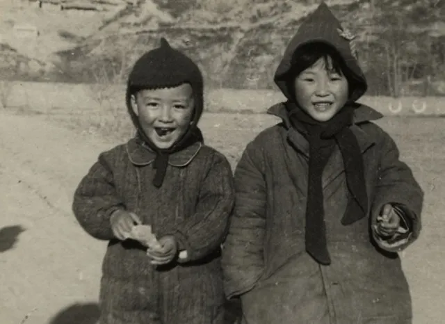 这对孩子头上戴的尖顶帽,边缘一圈线穗,棉衣鼓鼓的,手里攥着吃食,脸蛋冻得红扑扑,我一看就想起小时候娘念叨,孩子的头顶要包严实,风从那里钻,一夜就咳,这话一点不假。