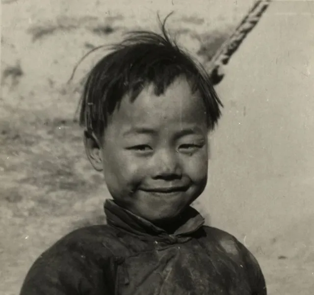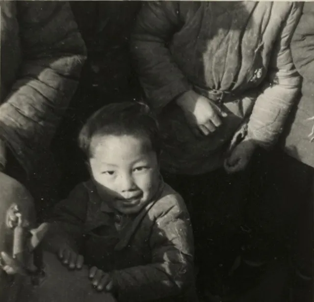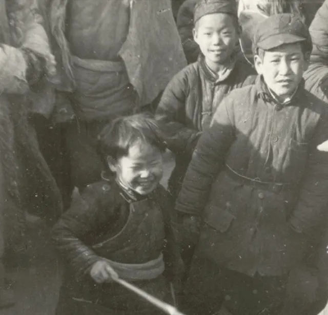 图中小童仰着脸,鼻尖一块亮,他是从人缝里钻出来的,胳膊肘像小锄头,拨开一片影子,眼神黏在镜头上,那会儿照相是稀罕物,孩子们围成一圈,笑声把寒气都顶回去了。