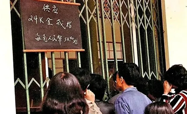 图里这块黑板最醒目,粉笔字写着24K金戒指和单价,铁栅栏一把拉着,大家挤在外头往里探头,牌价后面那串小数点把人看得直咽口水,我记得当年大人说一句“金价涨了”,就把耳钉放回柜子里,咱那会儿手里钱紧,买克重要掂好多回,今天商场里灯一照金光晃眼,可也没了当年站在窗口那股心跳,排队的时候有人嘀咕“先给闺女定个小圈”,有人算计“再攒两个月”,算盘在心里噼里啪啦响,照片里的人抬着脖子,像是都盯着同一个愿望。
