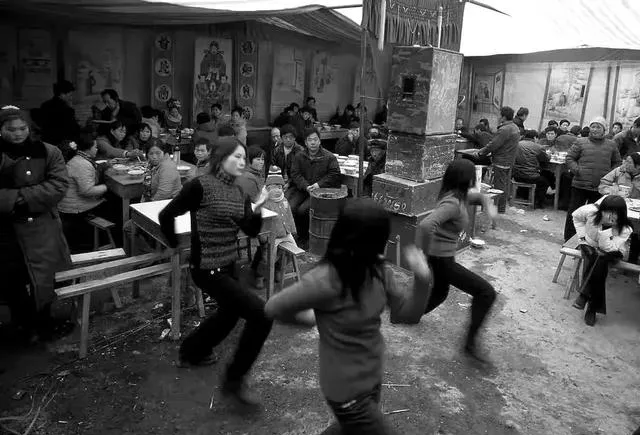 这张是乡下的大席面,棚顶扯着布,桌子一溜排到土路边,角落里还有火盆烤着手,前面一群女孩跳着迪士科,脚下起灰,后头大人夹着菜抬眼瞧两眼又低头吃,戏台子请了,热闹也有,年轻人偏爱这几下新潮的摆胯,叔伯笑着摇头说“这玩意儿一晚上五百”,转头还得掏钱给侄女塞糖,婚礼就是这样,旧的规矩压着坐席心安,新鲜的节奏也得跟一跟,过去请戏唱三天,现在请乐队一晚,热闹从没少过,只是换了响法子。
