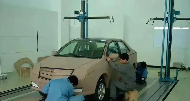 图中这台黏土车模叫造型样车,车身一层层刮成弧面,线条靠尺子比着抿,几个人猫着腰拿工具修边,灯光打下来不显山不露水,摸起来才知道有没有坑洼,我第一次见这种活还是在厂房参观,师傅抬手说“看这条腰线,差一毫米都不对劲”,那阵手机像素低,拍回去也糊成一团,现在电脑三维一转就出图,可落到手上还是要有人抹泥修型,车子再丑再好看,都是从这坨土里慢慢长出来的。