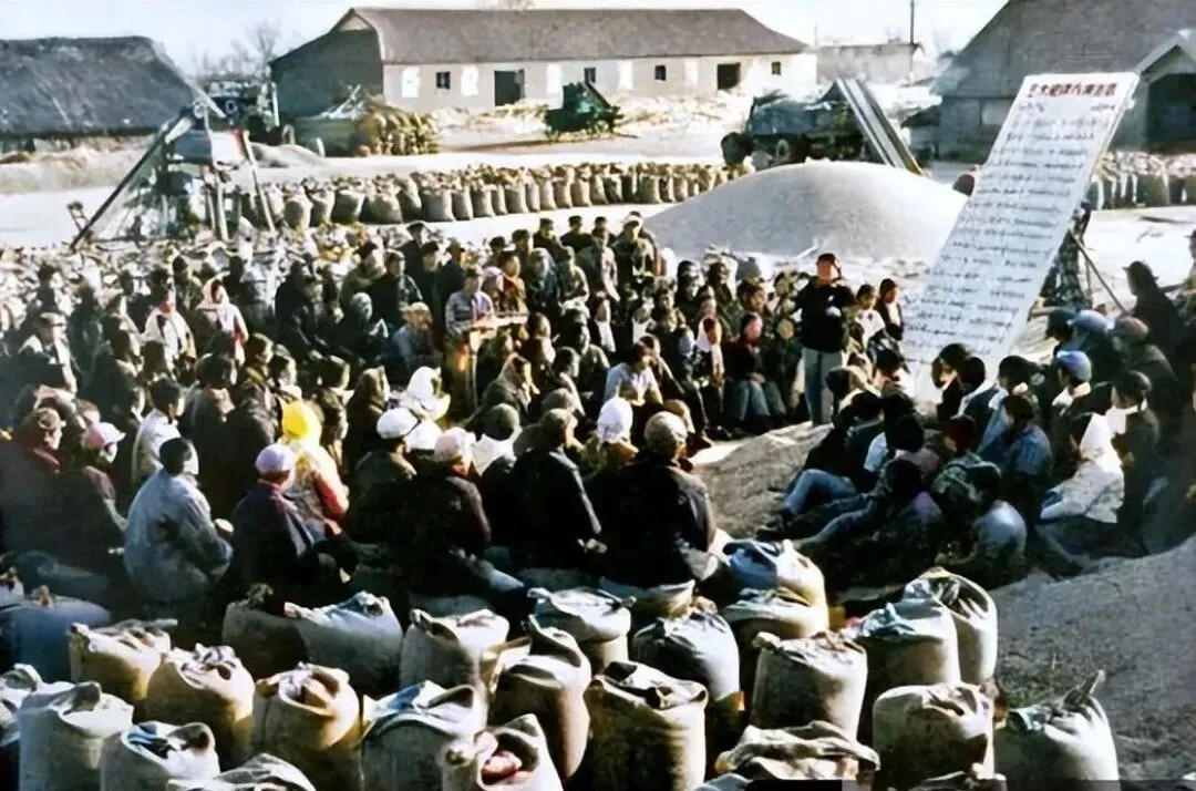 这块立在粮堆前的白板叫公示榜,谁分到哪块地,哪个小队干啥,逐条写得清清楚楚,旁边一圈麻袋码得齐,像一道城墙,把那点子底气也垒高了。