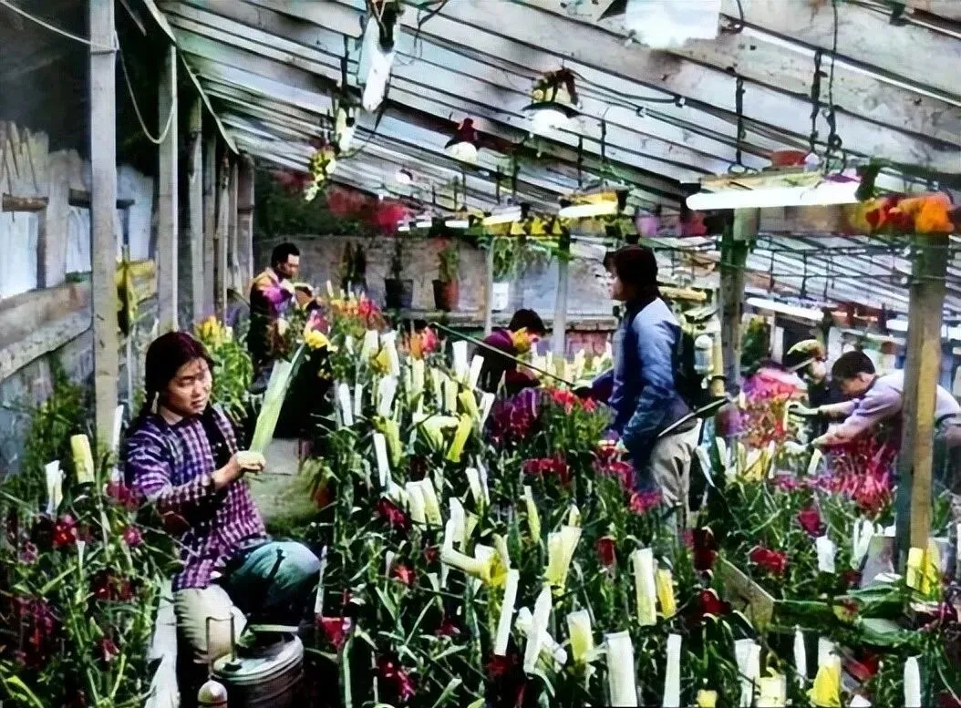 图中细长的纸条叫套花袖,套在花苞外面防冻防虫,姑娘们一手提着喷壶一手扯叶,灯泡照得暖洋洋的,玻璃顶上滴下来的水珠落在肩窝里一激灵,人却不舍得停。