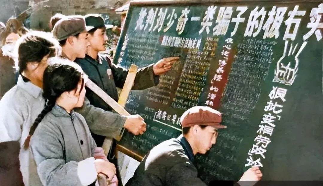 这块大黑板叫壁报栏,白粉字一笔一划写得硬,木尺横着比齐,边上小兄弟踮着脚描边,墨水在寒风里干得快,袖口蹭上一圈白道道,笑着说回去再洗。