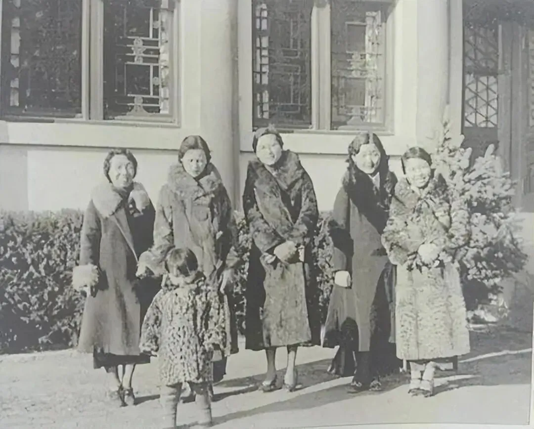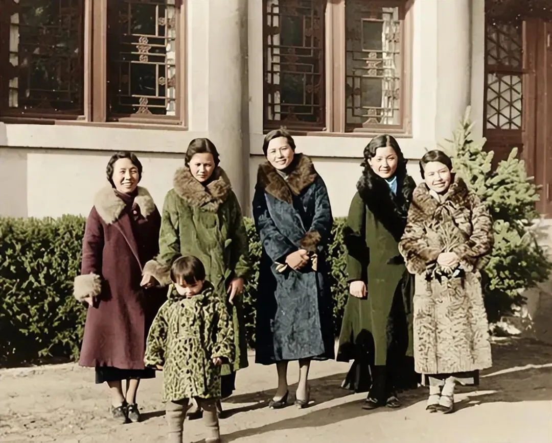 1932年,北平燕京大学南阁(当时的女部办公楼)前,画面左起依次是陈意、林徽因、雷洁琼、一位不知名女士、梁思庄,前排站立的幼童是林徽因3岁的长女梁再冰;几位女性身着统一风格的貂皮(裘皮)大衣,尽显当时精英圈层的冬日风尚。