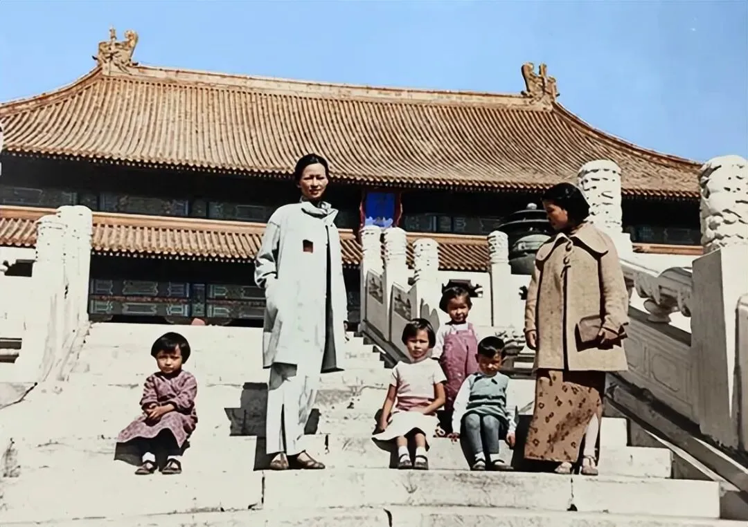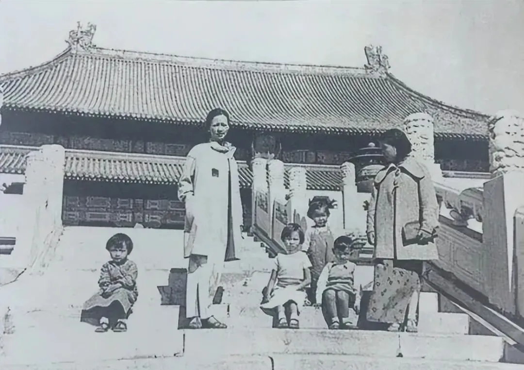 台阶上的四个孩子从左到右依次是:梁思永之女梁柏有、林徽因之女梁再冰、梁思庄之女吴荔明、林徽因之子梁从诫。1936年故宫博物院对普通游客仅开放中路部分区域,且需购票;但因梁思成 1935 年起担任故宫建筑修缮顾问,家族得以进入太和殿台基区域拍摄,这类权限当时仅向建筑、文物学界的少数研究者开放。