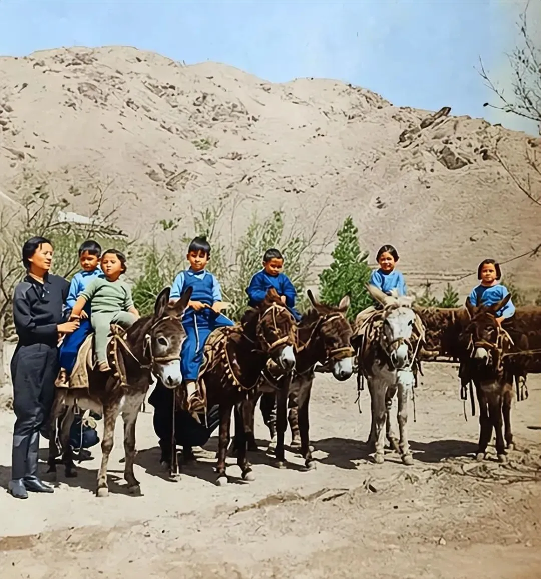 1936年,林徽因在北平香山带孩子们骑驴,左起依次是梁从诫(她的儿子)、吴荔明(梁思庄的女儿)、周嘉平(梁思顺的儿子)、一位不知名的孩子、叶彤(叶公超的女儿),最右侧是她的女儿梁再冰。