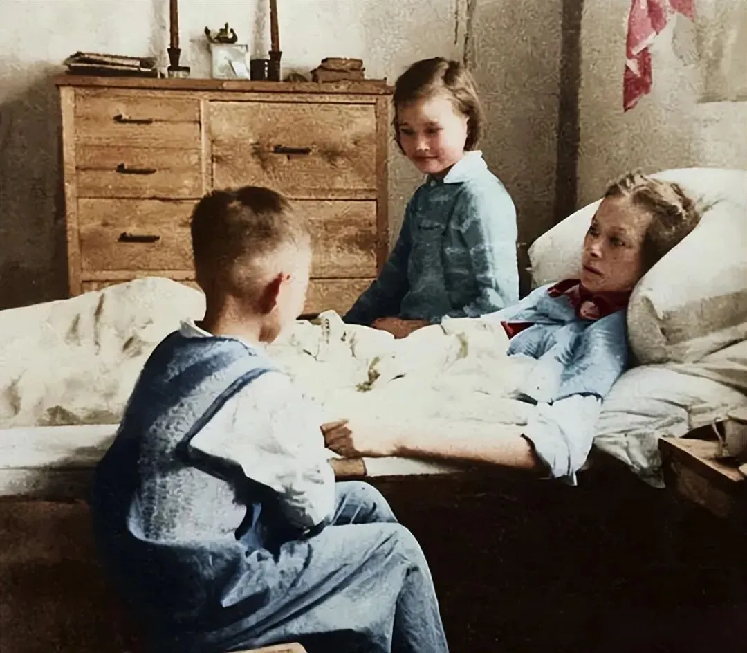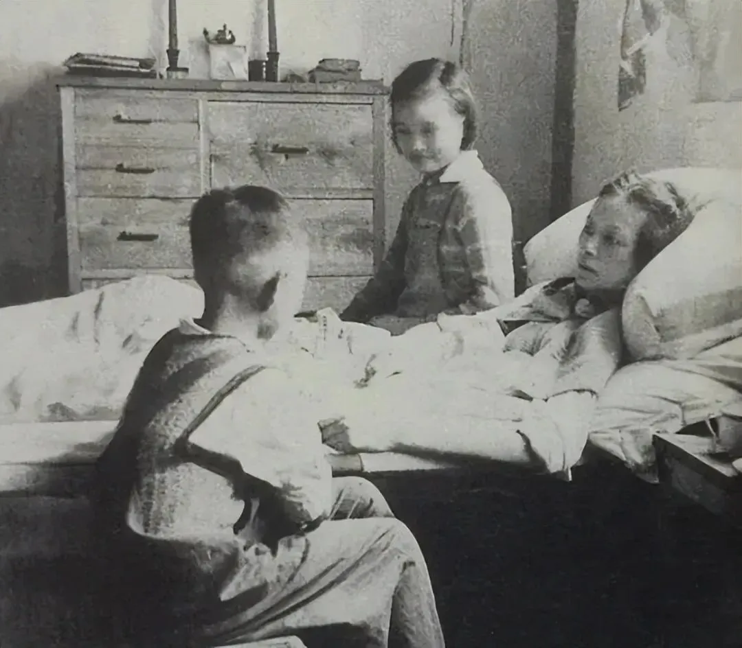 画面里,林徽因倚靠床头休养,11岁的梁再冰端坐床沿关切注视,8岁的梁从诫侧身坐于床前,两个孩子乖巧陪伴的模样,尽显对母亲的牵挂;房屋简朴的木柜与陈设,也衬出当时生活条件的拮据。