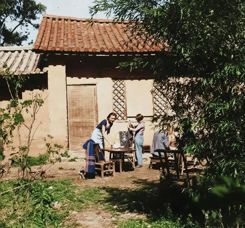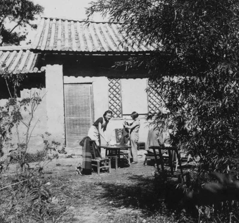 这是抗战时期林徽因与女儿梁再冰在昆明麦地村居所的生活照,照片里是昆明近郊的中式简朴民居,院落陈设简单,林徽因正与梁再冰在桌旁整理衣服。
