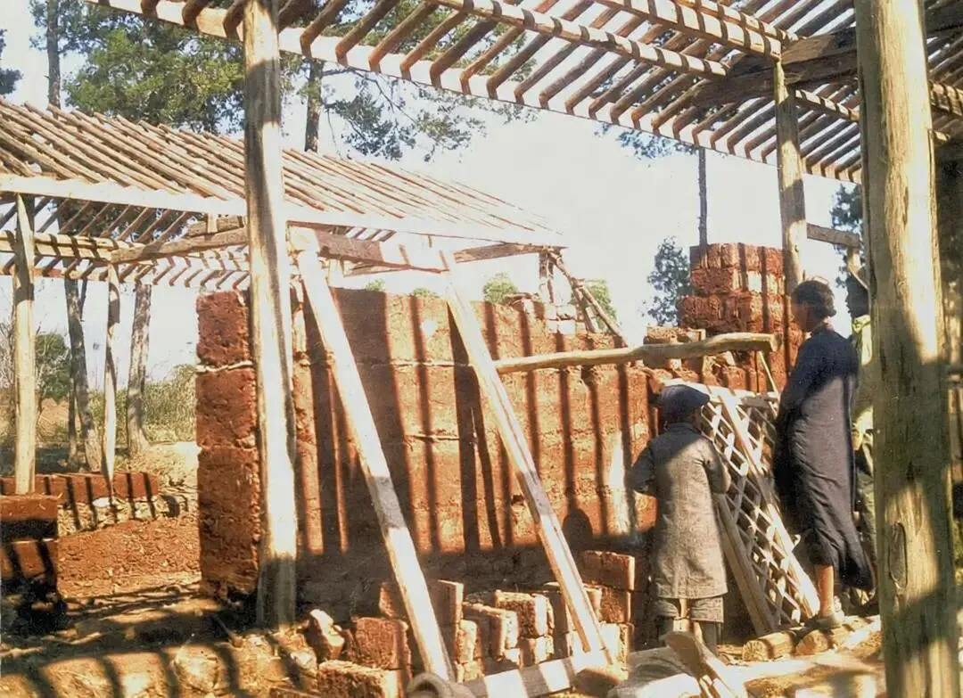这张照片定格了林徽因与儿子梁从诫在龙头村观看在建房屋,我们可以看到建房屋的砖石墙体、简易脚手架等雏形,周围散落着建筑材料,林徽因身着当时的日常服饰,与身旁的梁从诫一同关注着房屋建造进程,孩子的姿态流露着对施工场景的好奇。