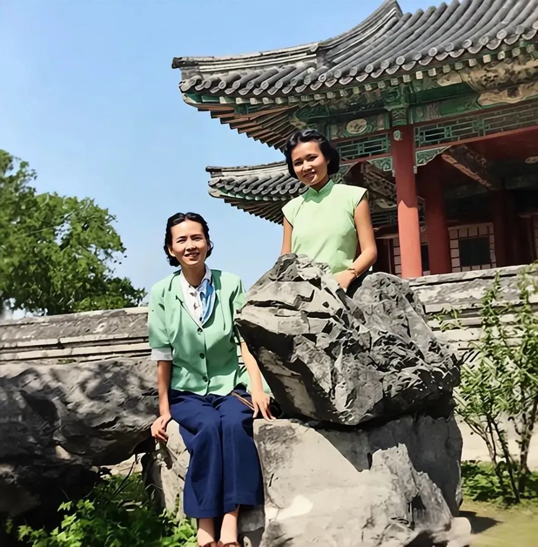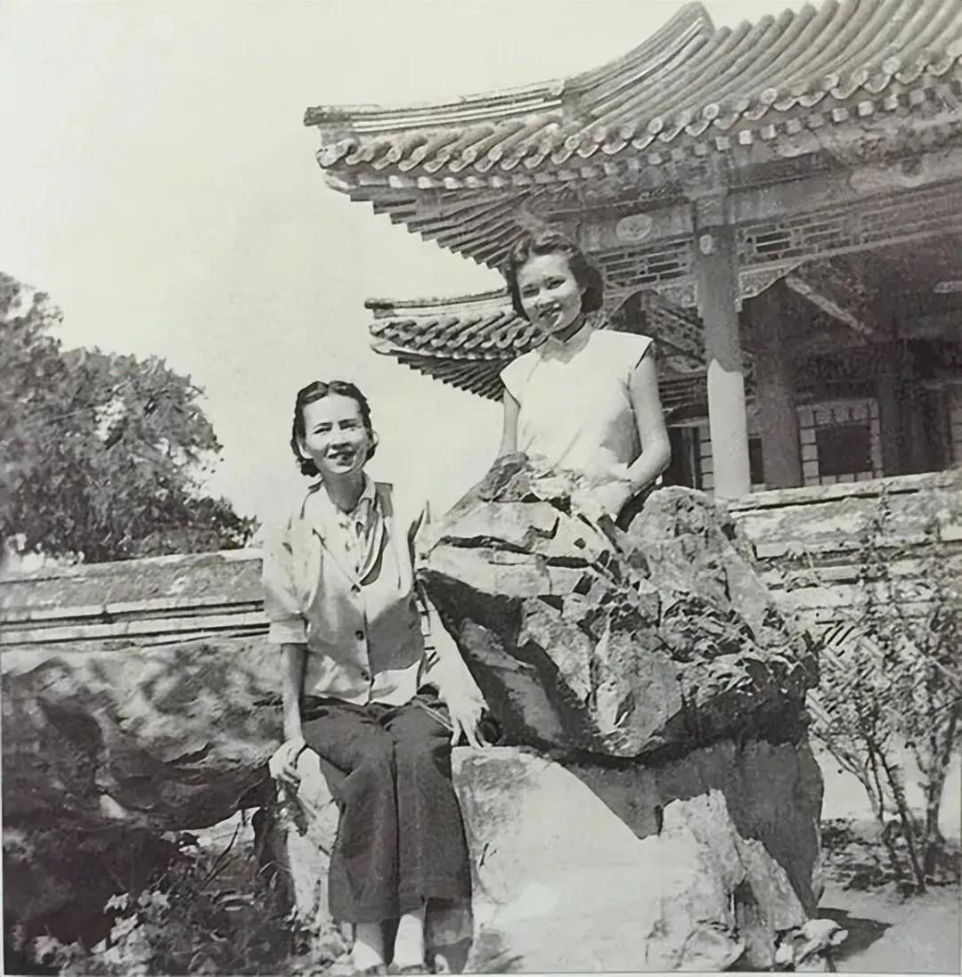 这张照片摄于1947年的颐和园,定格了43岁的林徽因与18岁女儿梁再冰的游园时刻母女二人相伴于园林假山石旁,身后是颐和园的古典建筑,衬出闲适松弛的氛围;