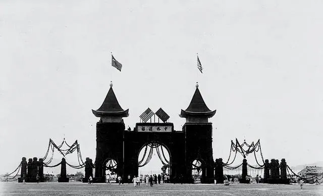 图中这座高高的迎宾牌楼就叫接驾牌楼,木架打底,黑呢子披面,檐角挑起两撮尖帽子,正中一块牌匾写着醒目的字样,左右缠着粗粗的绸缎和花结,旗杆上飘着两面不同图案的旗,山脊在后头压着气势,远远看去像戏台子搭好了就等主角进场,城里匠人一锤一锤敲出来的钉子在阳光里发亮,摆这个阵仗就是告诉人家,咱这回是下了功夫的欢迎。