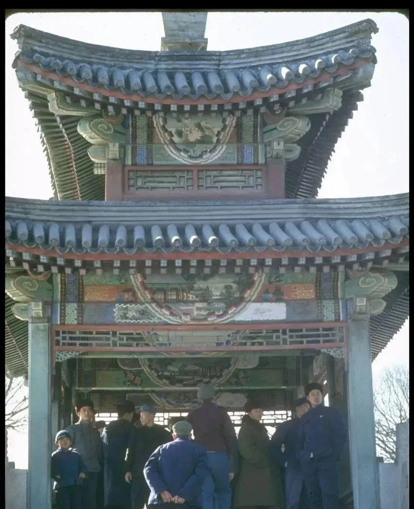 这个飞檐斗拱的叫彩绘牌楼,梁枋上滚青描金,团花里画着山水楼台,底下人群抬头看,袖口里搓手取暖,风从檐下穿过去,带着冷味儿,爸说木头活儿要养,看得懂的人一眼能挑出哪块补过漆,哪条纹路老到家了。
