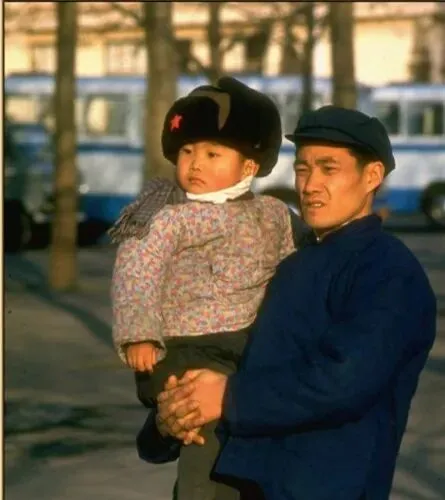 这顶黑呢帽子叫小号雷锋帽,前檐压着一枚红星,小孩被大人抱在怀里,脸蛋冻得透亮,围脖缠得结实,爸爸手上青筋鼓着,指尖粗糙,妈妈说那会儿拍照少,逮着阳光好就按一张,底片珍贵得很。