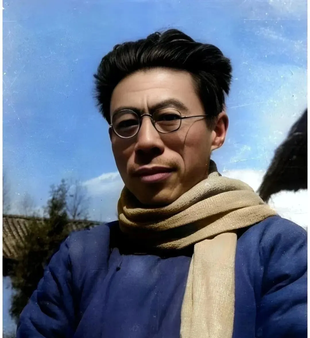 这个细圈眼镜叫圆框镜,鼻梁上稳稳一架,镜圈亮而薄,配个米色粗针围巾,绕两道就挡风了,蓝布长衫随风一摆,天光打在镜片上反一块小亮点,我小时候见爷爷翻旧抽屉,摸出一副铜圈眼镜,还会用手背擦一擦镜面,说读书人离不开这玩意儿,以前镜片容易刮花,现在换新片方便得很,老镜框却越看越带劲。