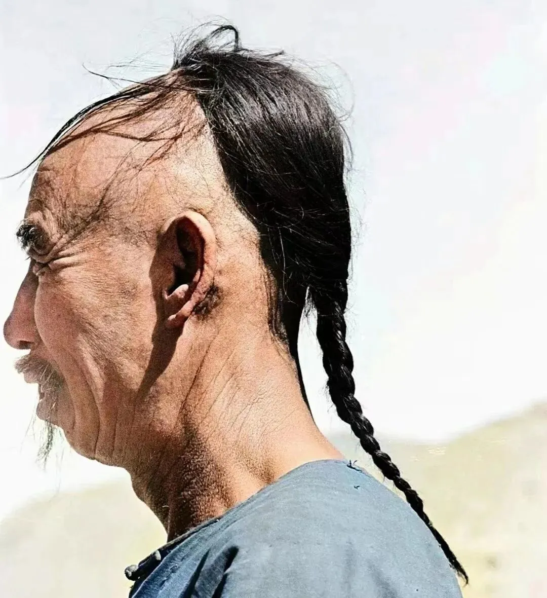 这个头发样子叫辫发,前额推净,后脑勺留一股长辫,乌黑发丝拧得紧,风一抽就轻轻荡,老人笑说小时候梳辫子得抹点油,免得飞毛扎眼,后来剪辫新政一来,院子里“咔嚓”声此起彼伏,辫子装进布袋里还舍不得丢,现在小孩儿扎发辫只是嬉闹,哪懂那一刀下去的滋味。