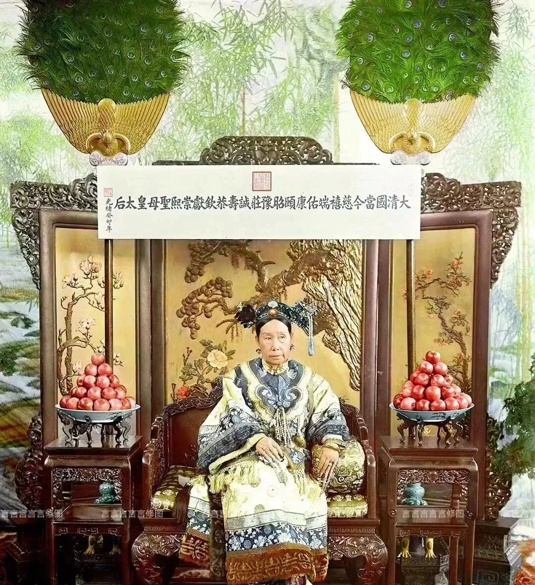 这个豪华坐具叫罗汉床,雕花厚密,背后屏风绣山水松鹤,边上高脚几上堆着团寿石榴,红得发亮,衣纹一路垂坠到脚背,袖口团花团起一圈,奶奶指着电视里宫装戏说你别看热闹,真衣裳可沉呢,走两步都喘,现在影楼能租到仿做的,拍照好看,真要穿一整天,胳膊得酸。