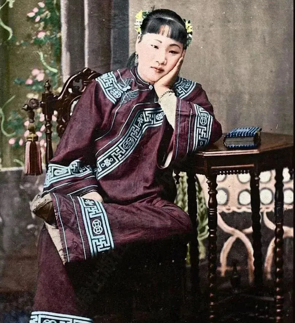这件紫栗色长袄滚着海水江崖纹的蓝边,袖筒阔而软,手一托腮,椅子是雕花靠背,旁边一张小案,案上压着书帖一本,妈妈说这坐姿一看就是拍照师傅摆的,脸上那点倦意却真,想起我小时候在照相馆,师傅掰我下巴说别动啊,小孩儿偏要眨眼睛,现在随便连拍二十张,总能挑出一张不眨的。