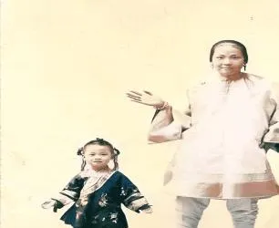 图中这对母女穿的是细缎子的袄裤,小的梳双丫髻,发梢上压着小银片,母亲袖管宽大垂着光,笑里有点拘谨,背景干干净净像照相馆刚刷的墙,那时候穿一身出门拍照不容易,家里得先把衣摆烫平,孩子站不住要逗两句才肯看镜头,我奶奶说拍照前还要在镜面前练几下手势,怕一举手就把袖口的滚边露乱了,现在手机一抬咔嚓一下,那个讲究是看不见了。