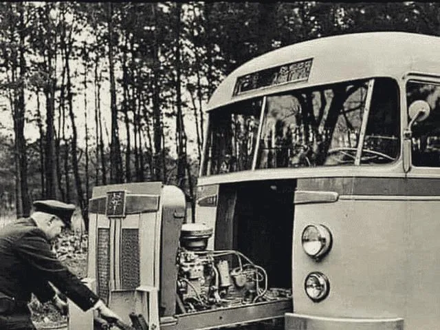 图中的这台大巴车鼻子掀开,前头露着柴油机,格栅像一片片竖排的鱼鳞,司机袖子挽到肘窝,拧着扳手往里探,车牌上小字密密麻麻,那会儿的车讲究结实耐造,坏了就地一修继续上路,现在一有故障电脑一连线,连声音都不肯多听一耳。