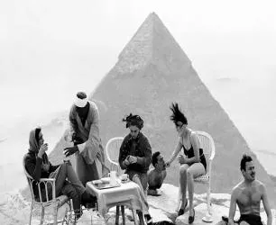 照片里几个人在金字塔前喝茶,桌子椅子摆得四平八稳,头巾被风吹得乱飞,太阳把影子压得很短,旁边有人光着膀子晒得通红,曾经可以这样登顶,现在早就不让了,规矩一严,故事也就留在相纸上,茶杯边沿那一道亮光,像还在抖。